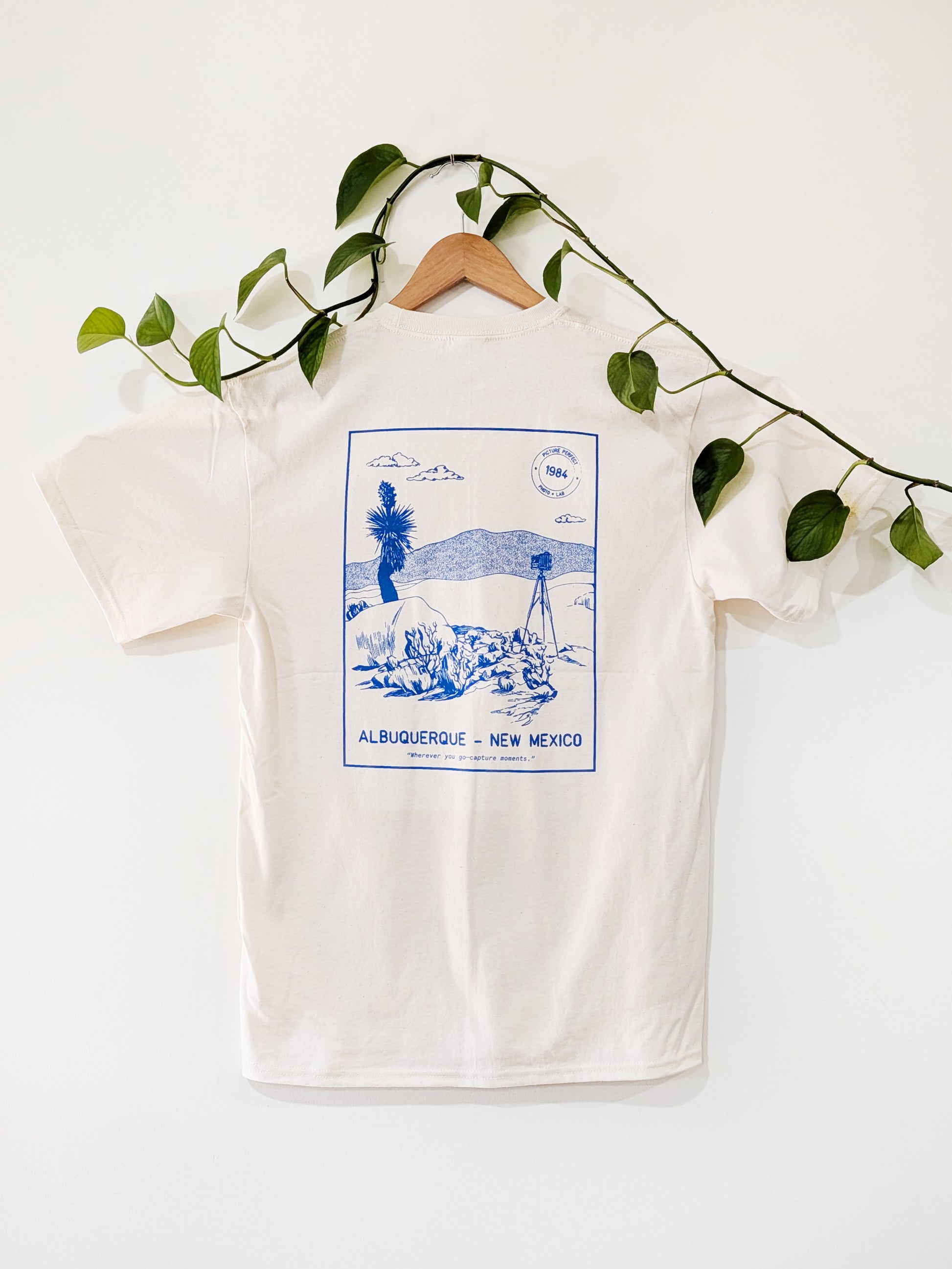 Short sleeve in cream with navy blue screen printed design. Our classic Picture Perfect job bag designed by Claire Plymale. Printed by Zia Graphics in Albuquerque, New Mexico.
